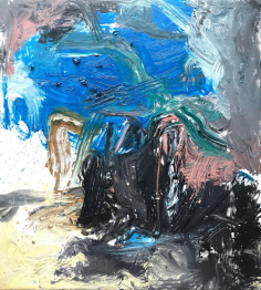 Fahar, Ölstift auf Autowaschschwamm, Hauptfarbe blau und grün, fast quadratisch, Kunst kaufen.
